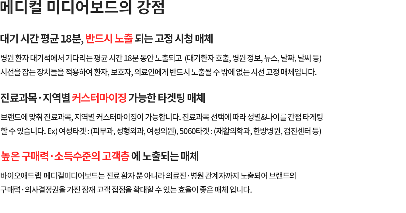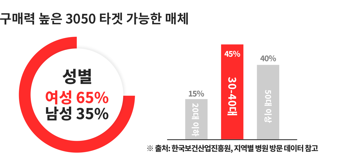성형외과, 피부과등 구구매력 높은 잠재고객을 타겟으로 만든 매체로수도권 병원 800기 이상 랜드마크 병원들에 설치되어 노출되는 매체입니다.