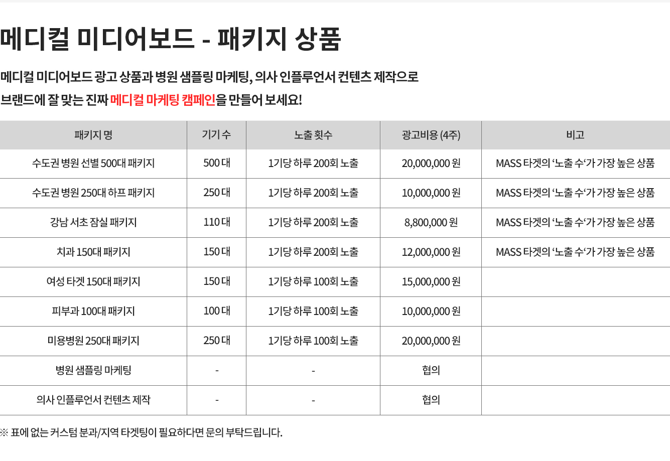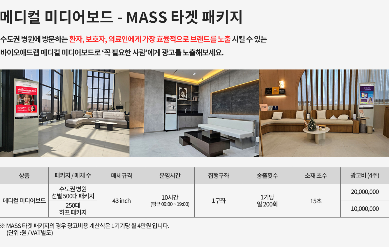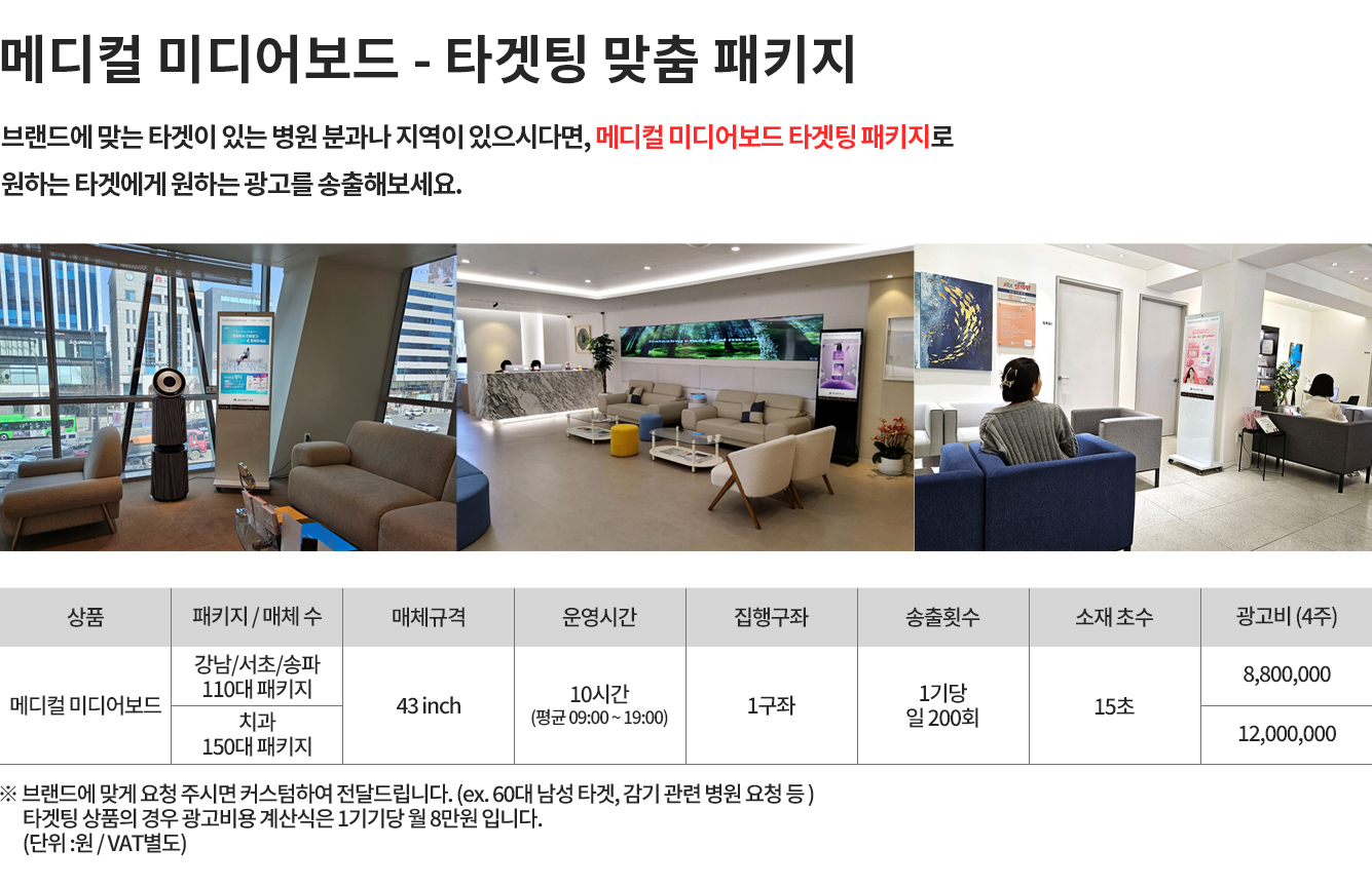 성형외과, 피부과등 구구매력 높은 잠재고객을 타겟으로 만든 매체로수도권 병원 800기 이상 랜드마크 병원들에 설치되어 노출되는 매체입니다.